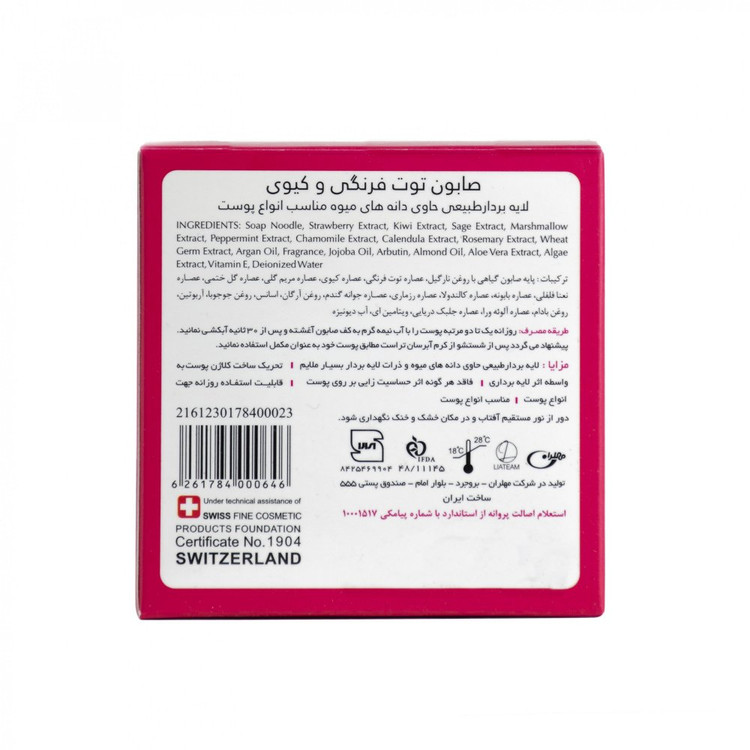 در این محصول جهت اثرگذاری بهتر و بیشتر، ضمن داشتن حس طراوت و شادابی در پوست، از عصارههای خالص توت فرنگی و کیوی کمپانی سیمرایس کشور آلمان به صورت اکستراپن استفاده شده است. ذرات لایه بردار گیاهی در این صابون به گونهای انتخاب شده که لایه برداری ملایمی را بر روی پوست انجام داده به همین دلیل قابلیت استفاده روزانه را داشته و بعد از 2 هفته استفاده، موجب روشن شدن و ایجاد احساس شادابی و جوانی در پوست میشود.