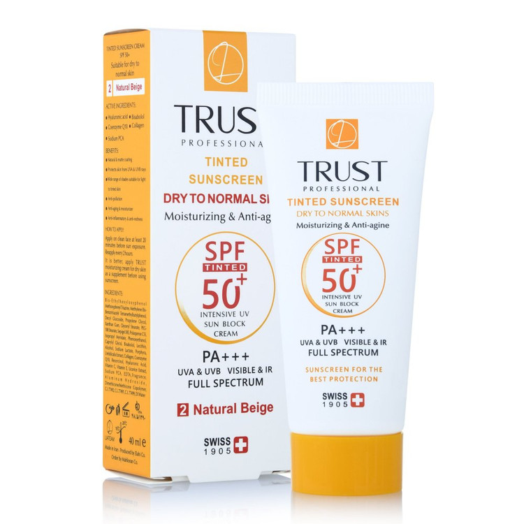 کرمهای ضدآفتاب رنگی تراست با SPF50+ از مرغوبترین و جدیدترین مواد اولیه موثره دارای حداکثر حفاظت دربرابر پرتوهای مضر خورشید ساخته شدهاند؛ این کرم با وجود بهرهمندی از بافتی سبک، دربرابر آسیبهای وارده توسط نور خورشید به خوبی از پوست محافظت و با مهار رادیکالهای آزاد از تخریب سلولهای پوستی جلوگیری میکند. همچنین با مصرف این محصول، بدون بسته شدن منافذ پوستی و ایجاد خلل در تنفس سلولهای پوستی، پوستتان آبرسانی میشود.