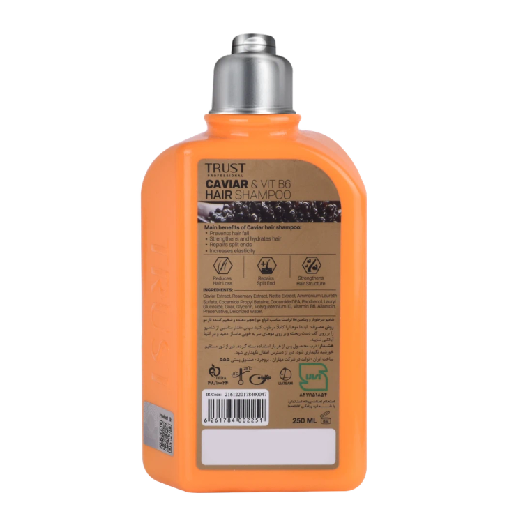 شامپو سر خاویار و ویتامین B6 تراست، با داشتن عصاره خاویار و رزماری، موجب تقویت تارهای مو و افزایش رشد آنها میشود. همچنین این محصول فاقد پارابن و سدیم لوریل سولفات (SLS) بوده و از آسیب به تارهای مو پیشگیری میکند. با استفاده از این شامپو میتوانید تارهای موی خود را ضخیم کرده و حجم آنها را افزایش دهید.